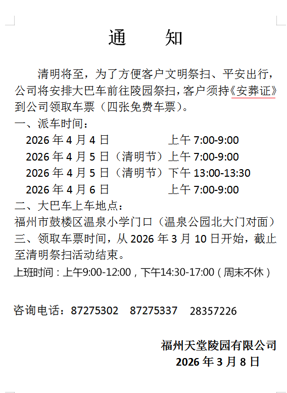 天堂陵园2026年祭扫免费大巴接送时间安排